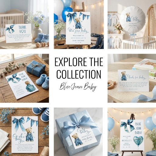 Set the scene for a joyful celebration with these blue jean baby themed baby shower invitations. Featuring an adorable bear in denim dungarees, a sweet denim bow, and playful blue stars scattered across a modern invitation template, they're perfect for honoring the parents to be.