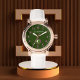 personalized watch, green dial, gold watch, white leather strap, elegant wristwatch, monogram gift, luxury accessory, custom initials, stylish design, timeless fashion