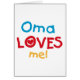 Oma Loves Me Tシャツ、カード、シール、ボディスーツバッグなど、カラフルレッド、イエロー、ブルーの文字とハートデザインを持つ。おま大好きなアパレルとギフトアイテムが大間スマイル!