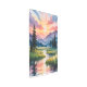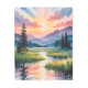 A serene watercolor sunrise over a calm river reflecting pastel pinks, purples, and yellows. Tall pine silhouettes frame layered misty mountains under fluffy colorful clouds, creating a peaceful, uplifting scene of natural harmony and new beginnings.