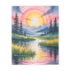 A bold psychedelic watercolor with a radiant sun encircled by pink ripples rising over a reflective river. Dark pine trees frame lush green meadows and distant blue mountains under a vibrant pink-to-purple sky, radiating epic energy and cosmic serenity.