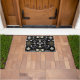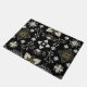 Ornate black and white floral pattern with gold accents. Central symmetrical flower surrounded by leaf motifs and intricate branches. Elegant, decorative design.