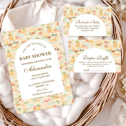 A whimsical watercolor design featuring a playful mix of pastel summer animals surrounded by tropical leaves, seashells, starfish, and soft botanical details. The cheerful palette of peach, mint, coral, and soft blue creates a light storybook atmosphere, while the elegant arch layout keeps the celebration details beautifully framed and easy to read. Perfect for a warm, joyful summer celebration with a charming nursery aesthetic.