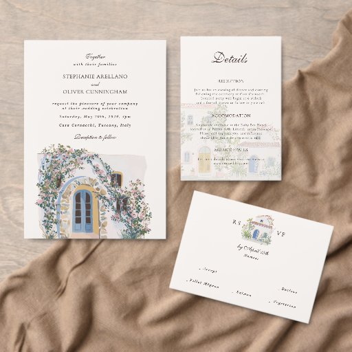 beautiful watercolor sceneryelegant script and serif fontssophisticated garden wedding stationeryelegant budget wedding invitationmonogram wedding invitationelegant italian wedding stationerypastel mediterranean wedding invitationmediterranean watercolor houses