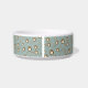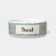 Pet bowl with a personalized dog name monogram in a cute script font paired with a pattern featuring ditsy paw print cookies and sugar dollops as a background. Check out our store for more matching items from this collection.