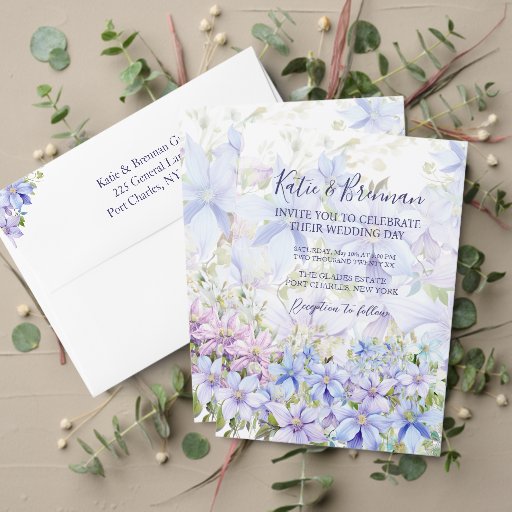 私たちエレガントのPeriwinkle Clematis Wedding Save the Date Photoは楽しいイベントを祝共有する素晴らしい方法だ。美しいペリウィンクルクレマティスの花がフローラの霜の付いた背景に溢れる。夏や春に最適。どんな美しい庭のテーマ結婚も完璧だろう