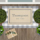 This simple and elegant custom monogrammed doormat features your family's last name in handsome serif block lettering with the year established below and a stylish striped border design. A beautiful keepsake gift for newlyweds or new homeowners. Includes a beige burlap background layer with a rustic textured appearance. Neutral light beige and charcoal gray design colors can be modified to coordinate with your home decor.