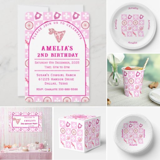 Designed with a trendy pink and white checkerboard pattern, this adorable plate features cowgirl-themed icons like boots, hats, horseshoes, wagon wheels, and lizards — all with a soft floral twist. The design is playful, modern, and feminine, making it the perfect match for any cowgirl birthday party, western baby shower, or country-chic event.