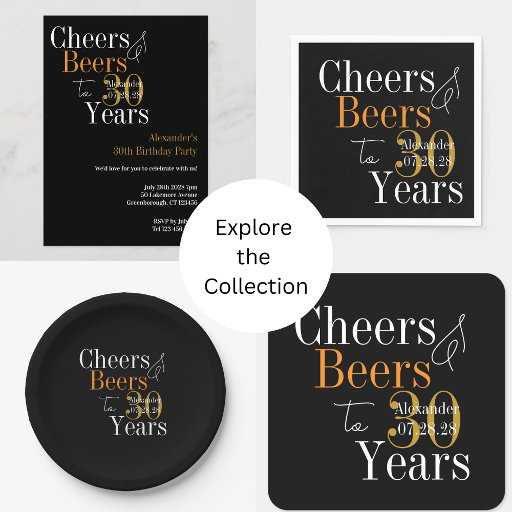 30th birthdaycheers and beersbeer partyadult milestone celebrationblack and gold designmodern typographymonogram namecheers to 30 yearsmens birthdaysimple classic cool fun