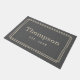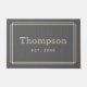 This simple and elegant custom monogrammed doormat features your family's last name in handsome serif block lettering with the year established below and a stylish striped border design. A beautiful keepsake gift for newlyweds or new homeowners. Includes a dark gray burlap background layer with a rustic textured appearance. Neutral charcoal gray and beige design colors can be modified to coordinate with your home decor.