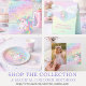This sticker has an enchanted unicorn with a flowing multicolor mane on a soft watercolor rainbow wash with sparkle accents and customizable text. This whimsical fantasy design creates a magical look for a girl’s birthday celebration.