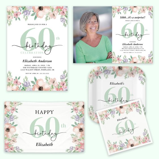 Photo 60th Birthday Party Pastel Floral 招待状