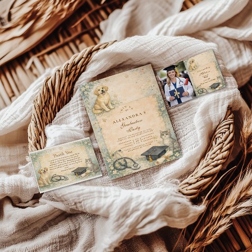 Celebrate years of dedication, late nights, and a deep love for animals with this elegant veterinary graduation design. Featuring soft botanical accents, a classic white coat illustration, and refined academic details, this invitation is perfect for honoring a new veterinarian’s milestone achievement. Ideal for veterinary school graduation parties, white coat celebrations, or professional graduation gatherings, this timeless design is fully customizable to match your event details.
