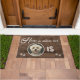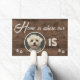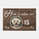 Photo Home is Where My Dog Is Personalized Cute Custom Welcome Mat | This cute and inspirational design features the quote "Home is where my [your pet's face] is" in modern and trendy typography, flanked with black pawprints, on a faux wood background. This is a great gift for the dog owner who loves their dog.