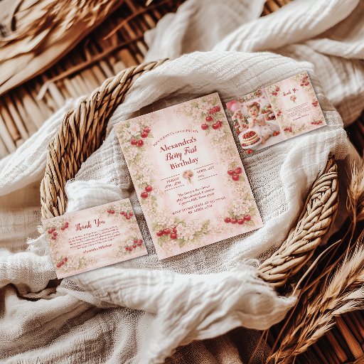 This blush strawberry garden collection features soft watercolor strawberries intertwined with delicate florals, creating a romantic vintage wreath aesthetic. Designed with a timeless, storybook feel, it’s perfect for celebrating a sweet first birthday with elegance and warmth. Ideal for strawberry-themed parties, garden celebrations, and classic floral styling, this design balances softness, charm, and refined detail for a memorable milestone.