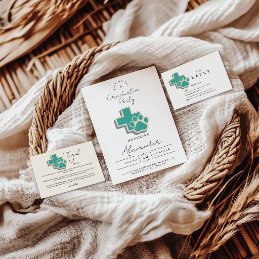 This graduation party design is created especially for a veterinarian graduate, featuring a clean, minimalist layout with a stethoscope and paw illustration. The modern black-and-white style keeps the focus on the achievement while adding a subtle, professional nod to veterinary medicine.