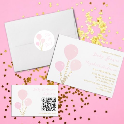 Pink Balloons Girl Baby Shower 招待状