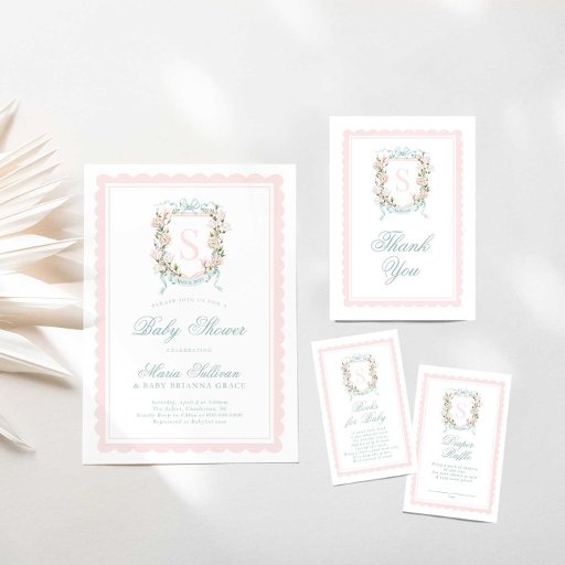 Pink Bow Monogram Floral Crest Baby Showerデザイン: Britt at Helia Design Co.