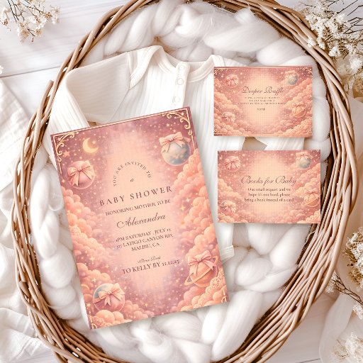 Pink Celestial Bows Clouds Baby Shower 招待状