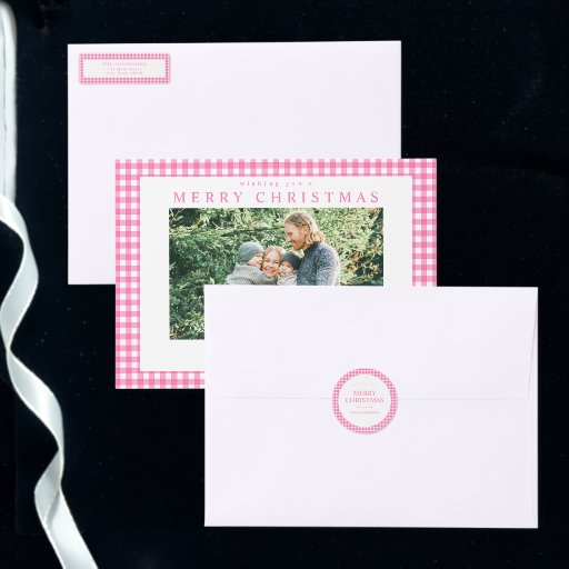 Create your own custom return address labels for Christmas cards featuring personalized minimalist typography on a cute pink gingham plaid pattern background.