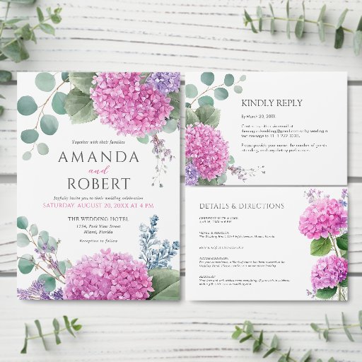 Pink Hydrangea Watercolor Flowers Elegant Wedding 出欠カード