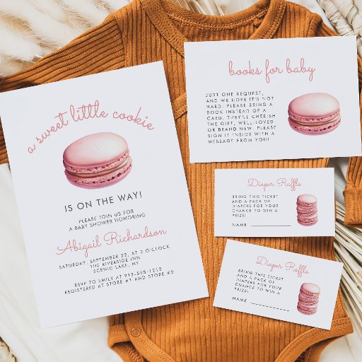 This cute baby shower enclosure card features a watercolor illustration of a pink macaron cookie. Above, the words "books for baby" appear in trendy pink handwriting script. The editable message is in gray sans serif font. The back of the card features a white geometric pattern on a pink background. Ideal for a girl's baby shower.