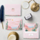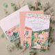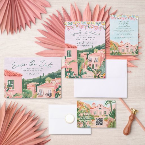 This destination wedding invitation features painted artwork of a Mexican desert beach scene. All the important wedding details can be personalized. Colors include green, pink, white and coral. Text in green.