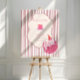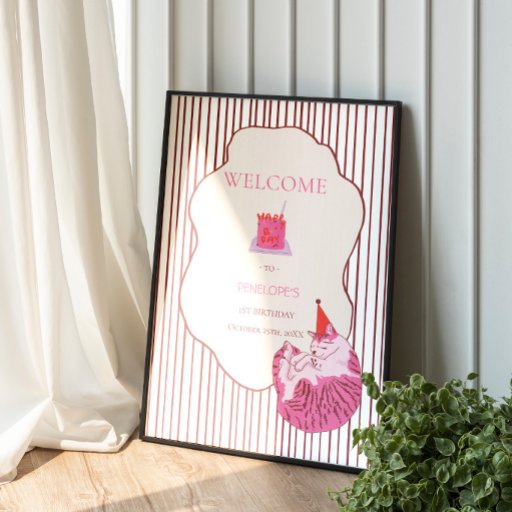 Celebrate a purr-fect first birthday with this adorable cat-themed Foam Board, featuring a sleepy pink kitty in a party hat, a tiny birthday cake, and a sweet striped background with a vintage-style frame.