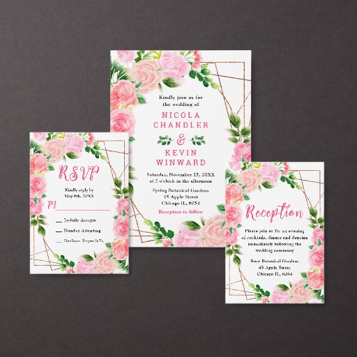 This fun and whimsical wedding menu features watercolor pink roses and foliage on a gold geometric frame. The text combines handwritten script and serif fonts for a stylish and modern look. This is perfect for a spring or summer rustic wedding.