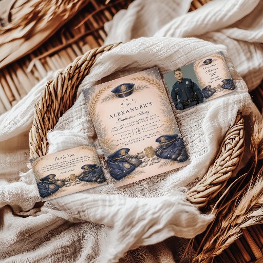 Celebrate a proud milestone with this elegant police academy graduation design, featuring a refined neutral palette, classic law enforcement details, and a formal ceremonial layout. Inspired by traditional graduation announcements, this design highlights service, achievement, and dedication with timeless style. Perfect for honoring a new police officer and sharing this meaningful accomplishment with family and friends.