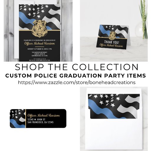 Honor the dedication and hard work of a new law enforcement officer with this customizable police graduation invitation. Featuring a police badge and the police force flag with bold black and white stripes and a proud thin blue line, this design symbolizes strength, service, and sacrifice. The invitation is personalized with the graduate’s name and party details, making it a memorable keepsake for friends, family, and fellow officers. Perfect for celebrating a police academy graduation, promotion, or milestone in a future officer’s career. Invite your guests in style and show support for the newest member of the thin blue line community.