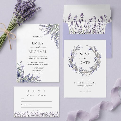 Purple Lavender Elegant Floral Wedding 出欠カード