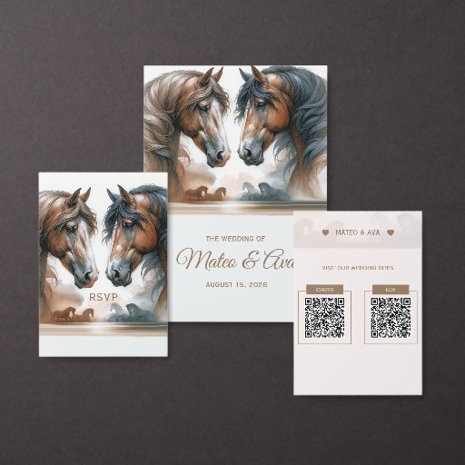 馬への共有は好きか?このQRコー結婚ドのRSVPカードを検討する。正面にユニークは美しい馬が並んでいる。自分だけのQRコードが背面に表示される。美し素晴らしい茶色の馬のデザインコレクションの結婚式招待状を補完。自然向けRSVPカード(ブラウンとアースのトーン色)。おカスタマイズ客様の文字でQRコードをカスタム作成する。テンプレートを使用して自分の馬の結婚式のRSVPカードを作成する。
