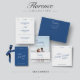A blue wedding RSVP card with a bold handwritten script front and a clean white back featuring a QR code for easy online responses. Fully customizable with your names, date, QR code, location and reply deadline. Part of the coordinated wedding collection "Florence" — explore matching stationery pieces to complete your suite. Mockups for this design were created using Midjourney AI.