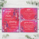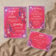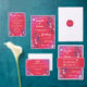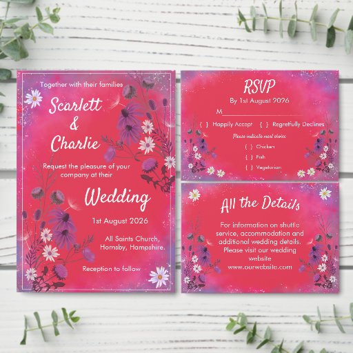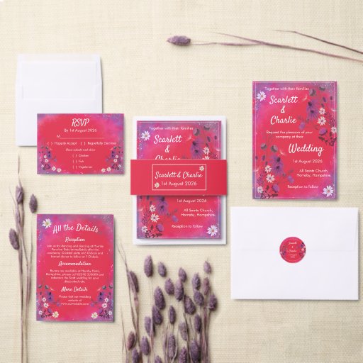 Vibrant, hand drawn raspberry pink design with wildflowers - invitation belly band vertical