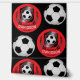 This soccer design features a bold shield-style emblem with a classic black and white soccer ball highlighted by a bright red background that creates a powerful and energetic visual impact. The deep red tone adds intensity and passion, while the black shield and laurel elements give the design a professional, team-crest appearance. Star details around the ball reinforce a competitive and achievement-driven theme commonly seen in soccer logos and badge designs.