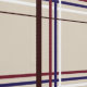 A tartan pattern in neutral, warm colors. Red, blue, and cream-colored bands run accross a muted pale tan background. A very fall aesthetic with a mix of rich and muted colors.