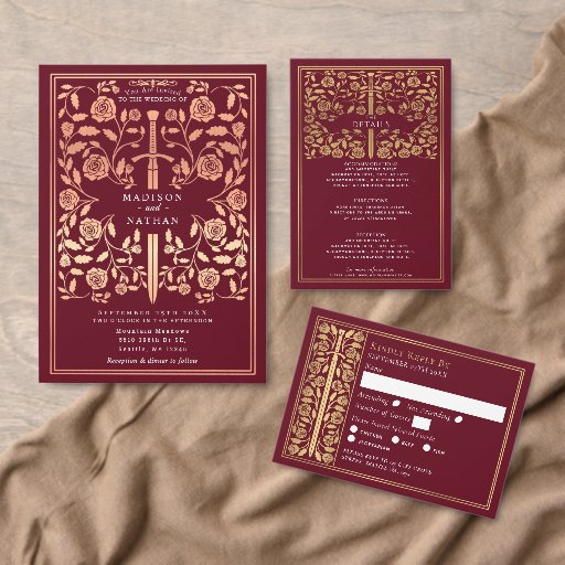 Red Royal Medieval Silver Sword Wedding 箔招待状