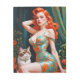 この魅惑的なイラストレーションは、ヴィンテージの魅力を醸し出す、流れる、燃えるような髪の華やかな赤毛のピンアップを特徴としている。オレンジ色の花で飾られた型枠に合鮮やかったティール(緑がかった色)ドレスを身に付け、touchの洗練を加えエレガントたドロップイヤリングで補う。その横には、ペンダント魅力的付きのティール(緑がかった色)カラーを身に着けた穏やかな表情のタビー猫が座っている。背景にはティール(緑がかった色)のカーテンとオレンジと赤の色合いで咲く花が濃厚でレトロな雰囲気を醸し出している。