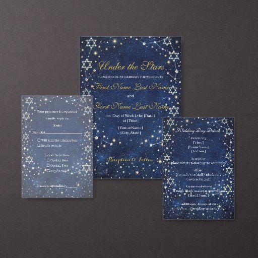 Complete your suite with this coordinating RSVP card designed in the same star-filled night sky. Gold constellation accents frame the design while leaving a clean, elegant space for response details. A perfect complement to the invitation, it keeps your wedding stationery cohesive and effortlessly sophisticated.