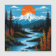 This stylish poster features a colorful and bold illustration of a retro mountain landscape in red, orange, and blue.