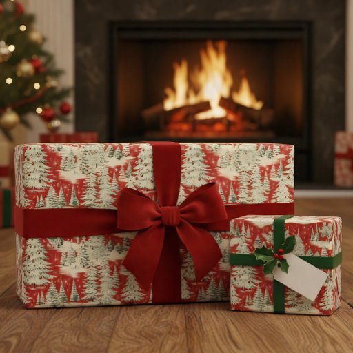 The overall design evokes a sense of nostalgia, reminiscent of classic holiday imagery from the past. The combination of the red background, the snowy landscape, and the elegant white Christmas trees creates a timeless and festive atmosphere.