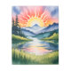 A breathtaking watercolor scene of a majestic sunrise bursting over snow-capped mountains, with golden rays illuminating a calm river winding through lush green meadows and evergreen forests. The reflective water and dramatic sun create a sense of hope and natural beauty—perfect for inspirational posters, canvas prints, and nature-themed decor.