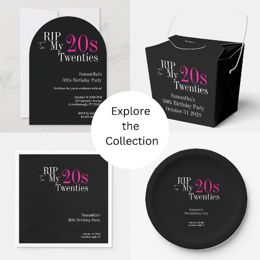 RIP 20s, 30th birthday party, black and pink, RIP 20s, Halloween adult birthday party design. - Simple RIP 20s design, is in classic black and white with a pop of hot pink. - Stylish typography design. - Easy to edit templates for you to simply add your name and birthday party details. Perfect for a cool and fun, Halloween themed, 30th birthday party. To personalize, simply use the personalize this button to add your name and party details, here you can also change the age, or the rest of the text if you want to. Check out the design editing tool to change the color or font. If you need help with personalization, matching products, or for a custom design, contact me via zazzle chat.