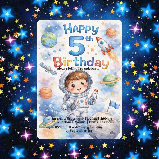 Blast off into an unforgettable celebration with this adorable 5th Birthday Astronaut Watercolor Invitation! Featuring a sweet smiling astronaut boy floating in space, surrounded by colorful planets, stars, and rockets, this design is perfect for little space explorers who dream of adventures beyond the stars. The soft watercolor style adds a magical, hand-painted feel while the playful typography makes it fun and eye-catching for kids’ parties. Easily customize the text with your child’s name, party date, time, location, and RSVP details to create a truly personal invitation. Perfect for space-themed birthday parties, astronaut celebrations, galaxy parties, and cosmic adventures — this invitation will set the tone for an out-of-this-world birthday experience! ✨ Features: • Cute watercolor astronaut illustration • Fun and colorful space theme • Fully customizable text • High-quality print design • Ideal for boys’ 5th birthday parties Make your little astronaut’s big day extra special — the countdown to liftoff starts here! 🚀🌙