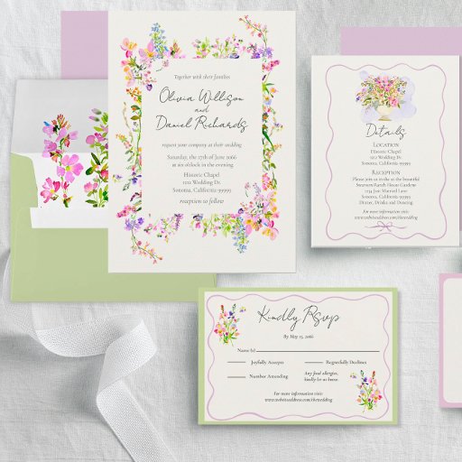 Romantic garden Green floral wedding enclosure card with lovely watercolor flowers, In beautiful pastel pinks, lavender and blues. Easy to personalize with lovely script typography.