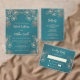 Rose gold floral line art cherry blossoms on a shimmering teal background. Matching wedding invitation available.