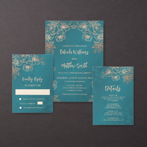 Rose Gold Floral Line Art Teal Wedding エンクロージャーカード