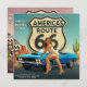 A bold, vintage-inspired Route 66 design featuring the iconic highway shield, a blue classic convertible, and a glamorous pin‑up pose set against a Southwest desert backdrop—perfect for road‑trip lovers, Americana fans, and retro garage décor