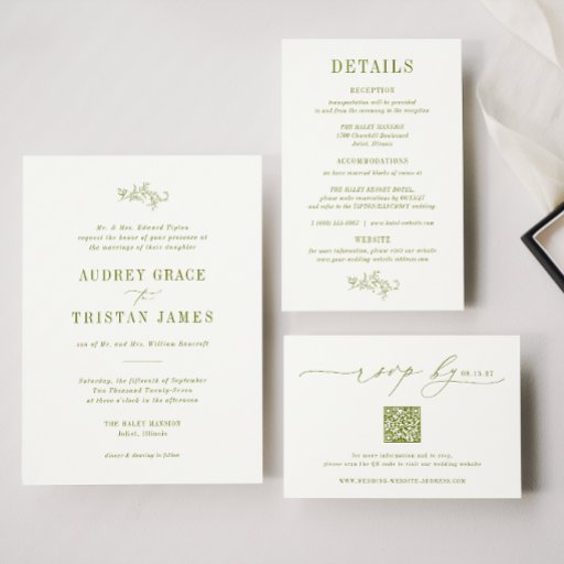 ROWAN | Modern Minimalist Botanical Greenery, wedding menu. Features, citrus moss green typography and botanical greenery illustration detail. Fonts and colors can be customized by using the design tool feature.